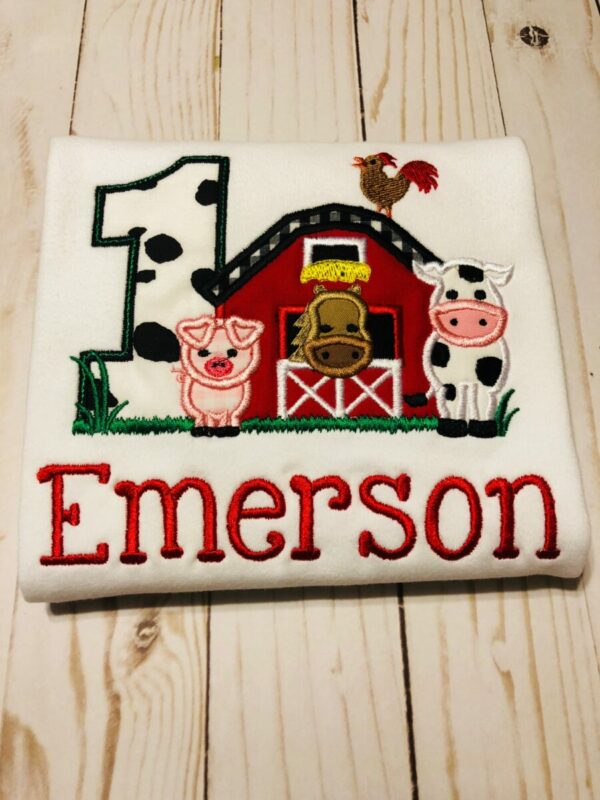 12 Month size T-shirt with Barnyard appliqué, Number One appliqué and Red color embroidery name that you will supply by noting in the Order Notes at check out.