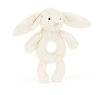 A treat for tiny hands, Bashful Bunny Ring Rattle can be grabbed by its soft paws, long lop ears or ring-shaped tummy. When given a gentle shake it will sound the rattle inside, much to baby’s delight! Crafted in a colored fur made from recycled fibers featuring a Bashful Bunny pink suedette nose and embroidery eyes