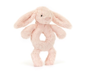 A treat for tiny hands, Bashful Bunny Ring Rattle can be grabbed by its soft paws, long lop ears or ring-shaped tummy. When given a gentle shake it will sound the rattle inside, much to baby’s delight! Crafted in a colored fur made from recycled fibers featuring a Bashful Bunny pink suedette nose and embroidery eyes