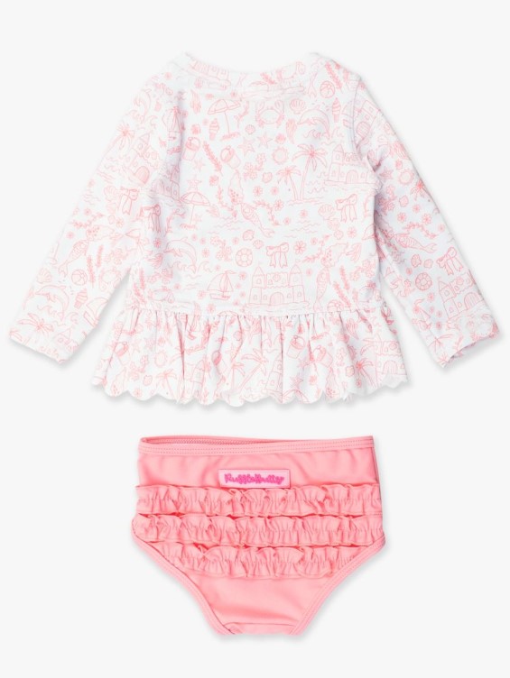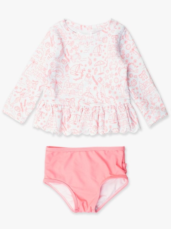 Style your favorite little girl in this Scallop Long Sleeve Rash Guard Bikini for beach day. This bottom is fully lined while the top is unlined. It’s made with UPF 50+ sun protected fabric for all day comfort and fun.