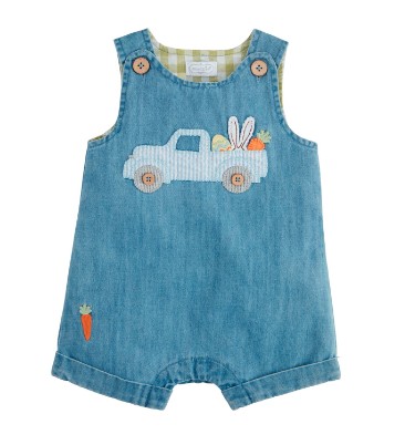 Appliqued denim Jon-Jon features coconut wood button shoulders, turned leg cuffs and inner leg snaps.