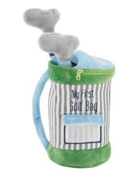 5-piece set. Interactive so-soft plush golf bag holds plush golf ball, driver, putter and putting green with kid friendly crinkle and rattle noises for hours of imaginary play.